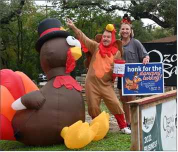 CBB Board members and Ozona Bank volunteers dress like turkeys to raise money for the Wimberley food bank.