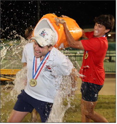 MARCUS GONZALES DRENCHES COACH ROBBINS TO CELEBRATE THE WIN. PHOTO BY JENNIFER KIRCHNER