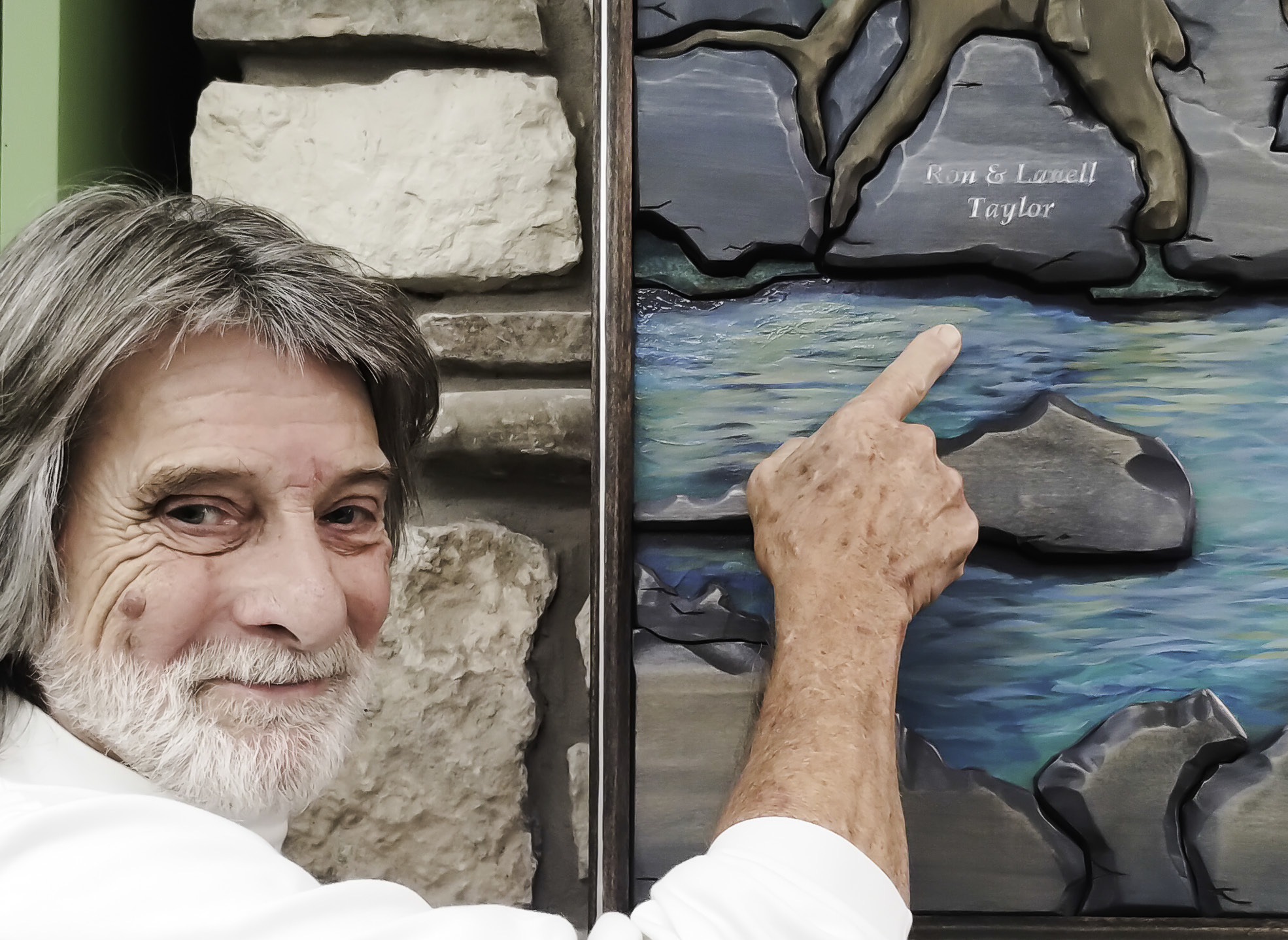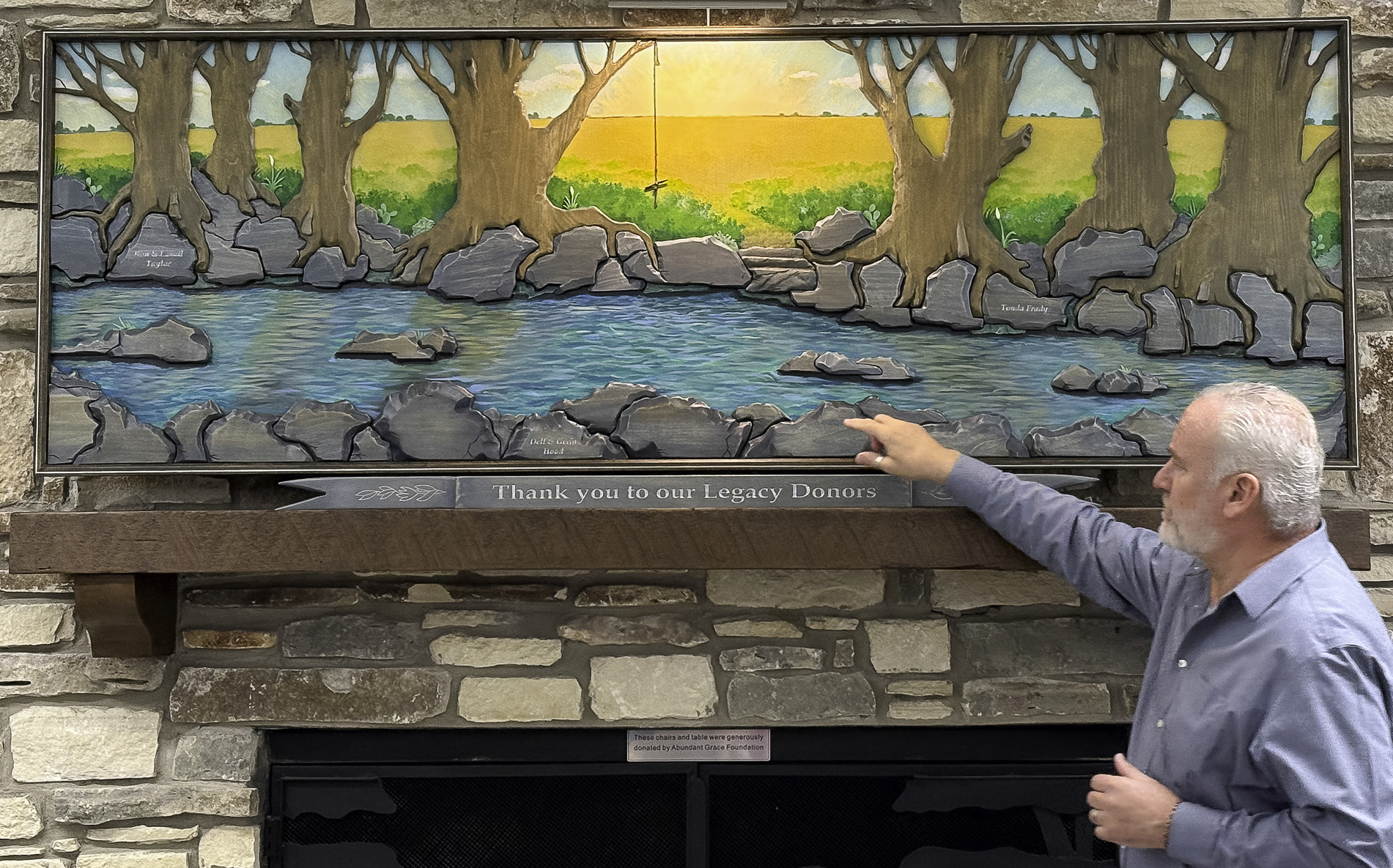 Together, artist Joshua Farrell and Director of Marketing and Adult Programs Nomi Gonzalez revealed Farrell’s multimedia board. Installed over the fireplace, the board depicted the sun setting behind the boulder-lined waters of Cypress Creek’s Blue Hole. The board’s “boulders” are removable so that donor names can be engraved on them.