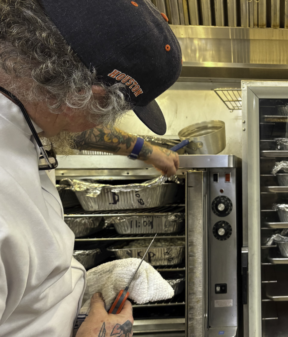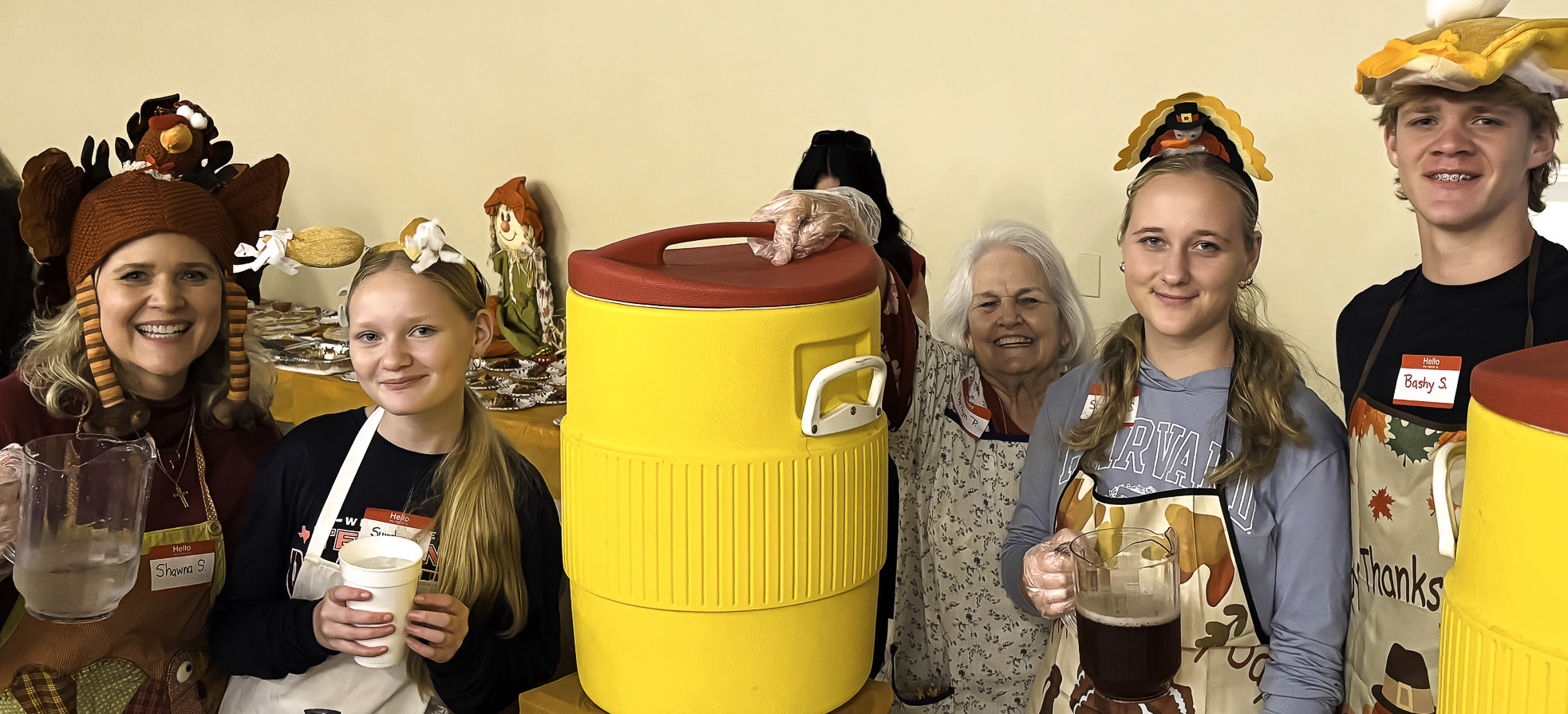 During the week leading up to the event, team leads spent long days getting ready. Kelly Evers, of Kelly’s Hill Country BBQ, smoked 36 turkeys. The set-up and decorating committees draped 30 banquet tables with warm orange cloths and centerpieces evocative of the season. Serving lines in the main dining room, as well as in a separate to-go and delivery staging area, were created along with side stations for desserts and drinks. A selfie wall, with an Autumn scene of trees turning colors, was set up so the day could be remembered.