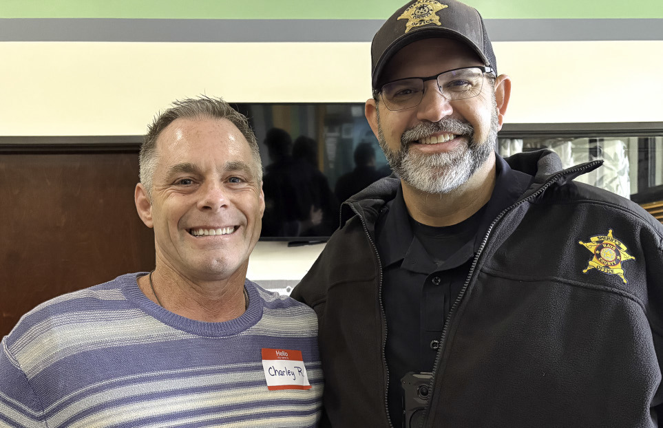 As the second shift volunteers arrived, the first shift volunteers sat down to their turkey dinner to swap tales and revel in the activity of the morning. Fresh greeters wished new arrivals, “Happy Thanksgiving,” hugged each other and caught up with old friends. It was the social event of the year for many of them. Claire Sharp, in charge of the front of the house, posed with Dave Lewis, long-time organizer of the dinner, at the selfie wall.