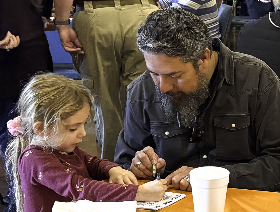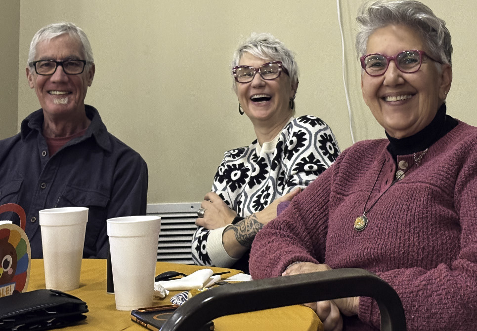 Promptly at 11 a.m. the doors opened and greeters, some of them standing on the sidewalk outside, ushered people in. Within minutes, a warm atmosphere of welcome, shared communion and cozy belonging bloomed into the expanse of the community center. Friends, neighbors and acquaintances greeted each other. Strangers turned to the side and introduced themselves, falling into easy conversation. As the people settled at the tables with their plates, easy conversation took up residence, punctuated by hums of “mmm” and “yum” as each of them tucked into the sights and smells of the meal. Soon, personal news mingled with other topics as a relaxed air set in. Images of a turkey with the caption, “Eat more chicken,” brought laughter. Kids crayoned papers as their parents watched, volunteers refilled glasses and took photos of friends dining with each other and teens offered to bring a slice of pie to the table.